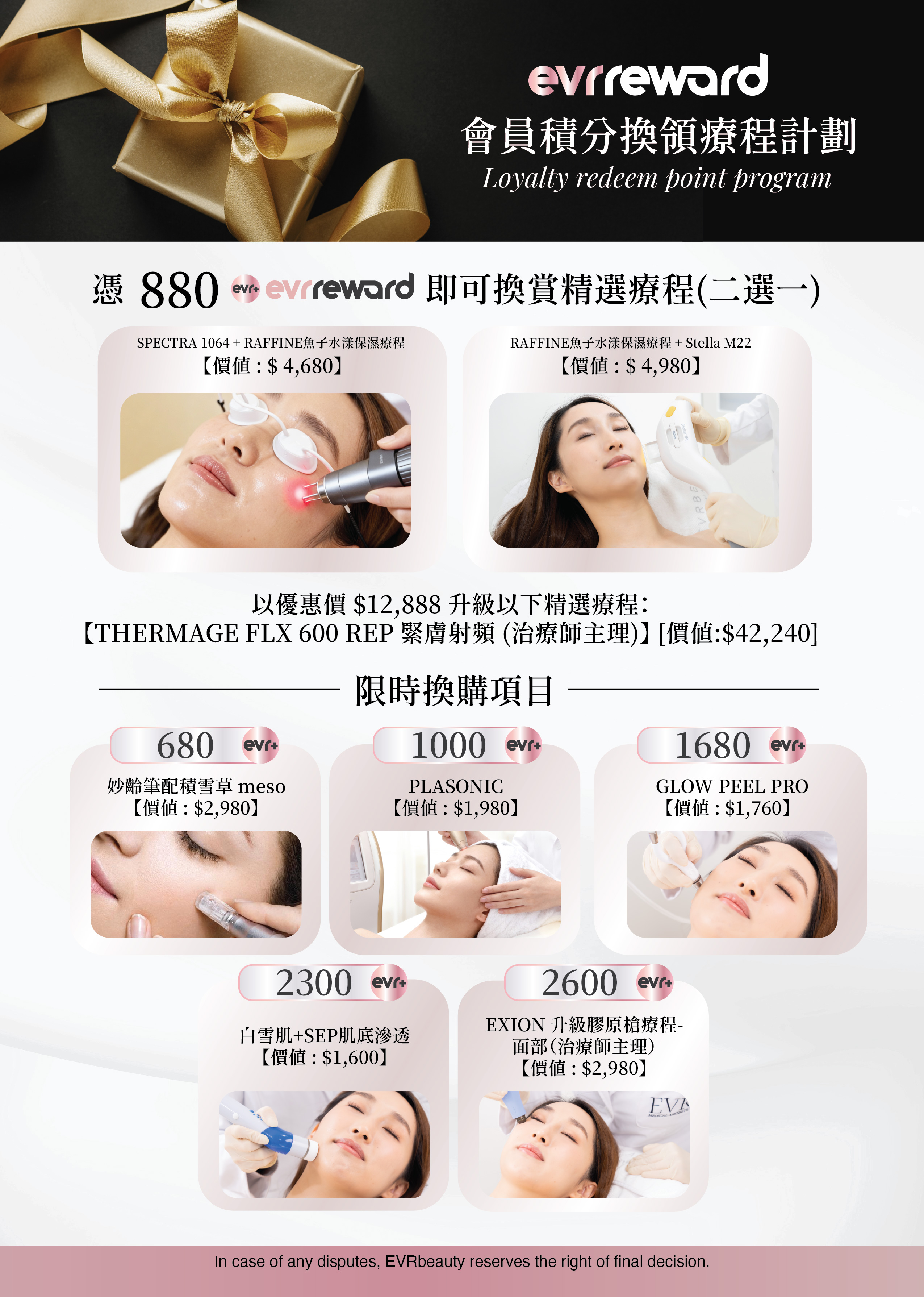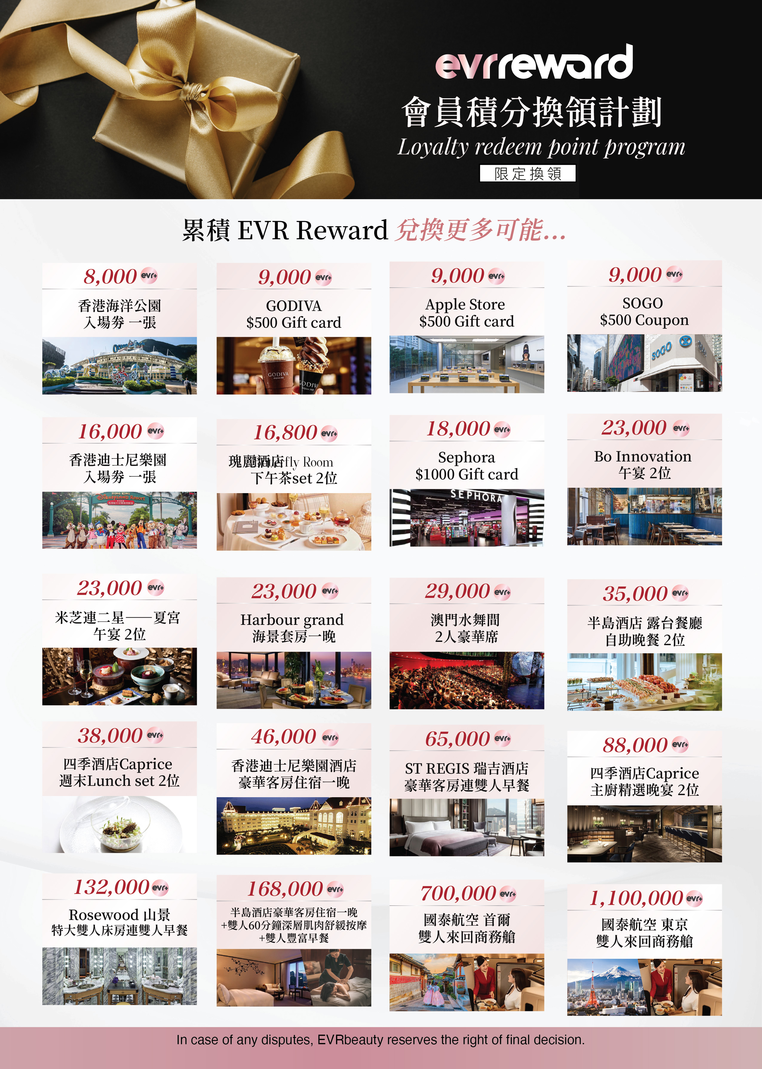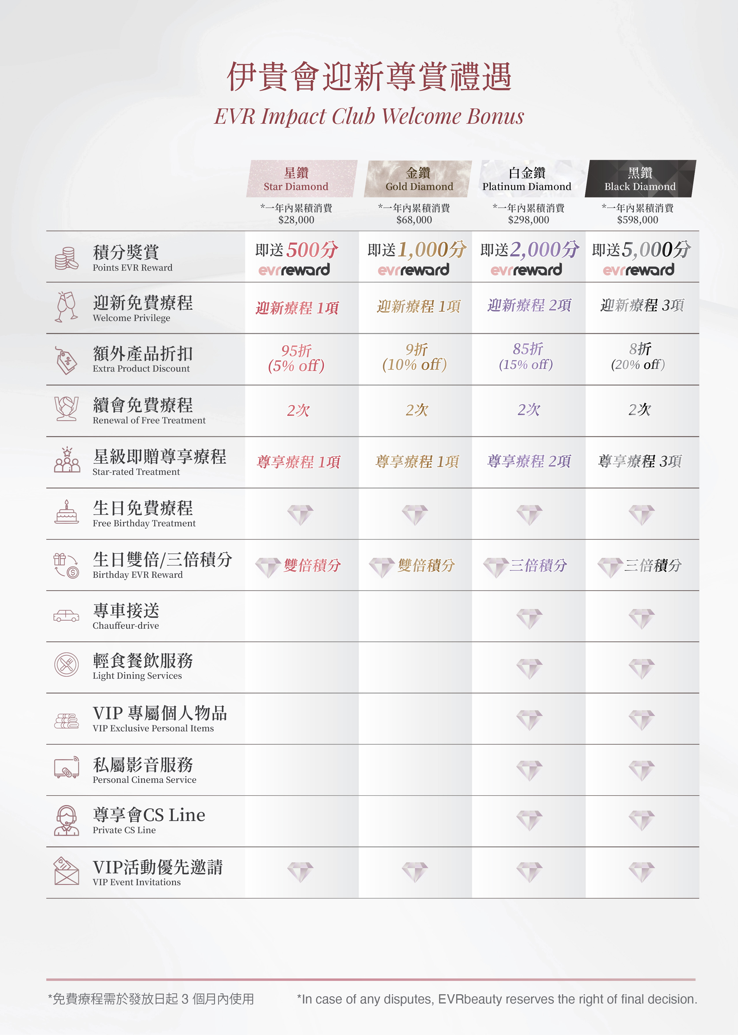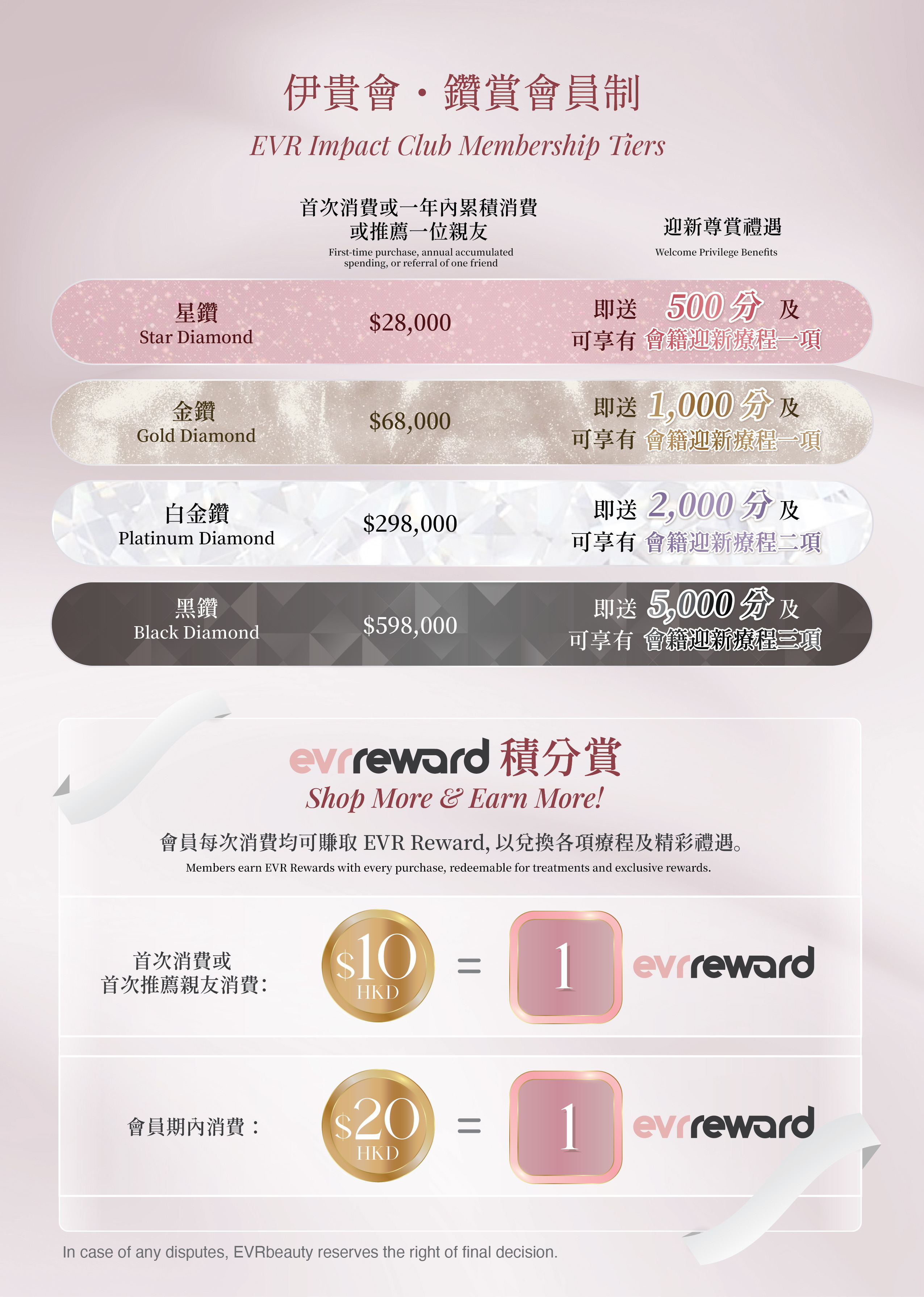 會員可根據消費累積,晉升不同鑽賞等級,尊享迎新療程、EVR Reward 積分、